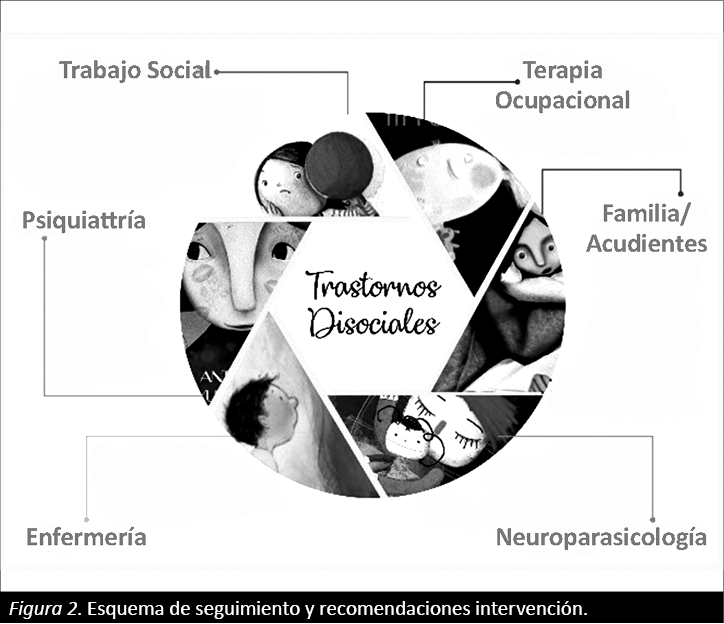 En cuanto al seguimiento y recomendaciones, teniendo en cuenta la influencia que el ambiente o contexto de desarrollo tiene sobre la etiología y el mantenimiento de los trastornos disociales y de las emociones mixtas, es necesario tener en cuenta el abordaje multidimensional que tienen este tipo de patologías. Por un lado, se requiere generar procesos educativos y de concientización sobre la patología y el manejo de ésta, con los padres o acudientes del paciente, con el fin de garantizar al máximo la prevención de recaídas y el fortalecimiento de aprendizajes adquiridos en el periodo de atención intramural. En segunda instancia, es vital el trabajo interdisciplinar para la intervención clínica, por lo tanto, es pertinente establecer procesos de comunicación permanente con algunos servicios ofrecidos en la institución, entre los cuales se encuentran: psiquiatría, enfermería, terapia ocupacional, trabajo social y psicología. En este sentido, este proceso permite evaluar la eficacia de la intervención, la permanencia de los beneficios adquiridos y el control de la calidad y garantía de los servicios ofrecidos. (Ver Figura 2).