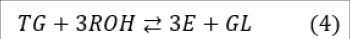 Según la ecuación 4 de la Figura 3, se necesitan teóricamente 3 mol de alcohol, por cada mol de aceite (triglicéridos) para todas las etapas de la transesterificación; ya que se trata de una reacción reversible, para desplazar el equilibrio de la reacción a la derecha y producir más biodiesel se usan cantidades más grandes de alcohol en relación molar aceite: alcohol de 1:6, 1:9, 1:12, 1:24, escogiéndose la relación de 1:12 (Reyero, Arzamendi, Zabala y Gandía, 2015).