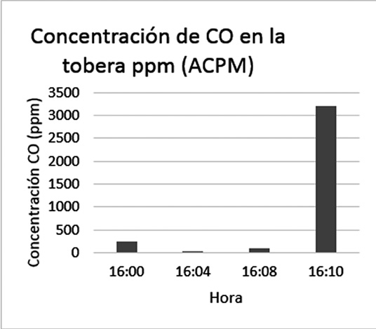 Suponiendo que las condiciones de uso de la caldera sean óptimas, presión de trabajo de 150 PSI, y se asegure la combustión completa de ACPM, se pueden explicar las concentraciones de los 3 primeros tiempos, pero el último dato (16:10) rebatiría esta hipótesis, por lo que se necesita mucha más información para considerar una conclusión. (Ver Figura 13).