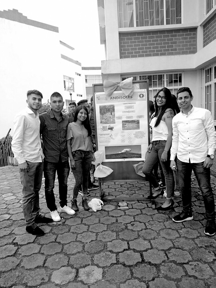 El día martes 24 de abril, siendo aproximadamente las 7:20 de la mañana, se encontraron los estudiantes de ingeniería ambiental que toman el curso de geología, en la plazoleta de María Inmaculada de la Universidad Mariana en Pasto, con el fin de ultimar detalles para la exposición de las características, usos, importancia, etc., de los suelos que en clase previa se había asignado. En la Figura 1 se evidencia el inicio de la actividad y la presentación del póster.