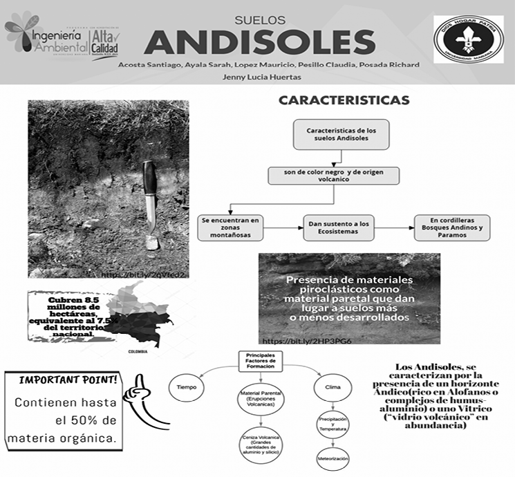 Al segundo grupo le correspondió el tema de suelos Andisoles, estos son oscuros, de origen volcánico y con mucha materia orgánica. En la Figura 2, se puede ver el póster que se expuso, donde se encuentran las características de este tipo de suelos.