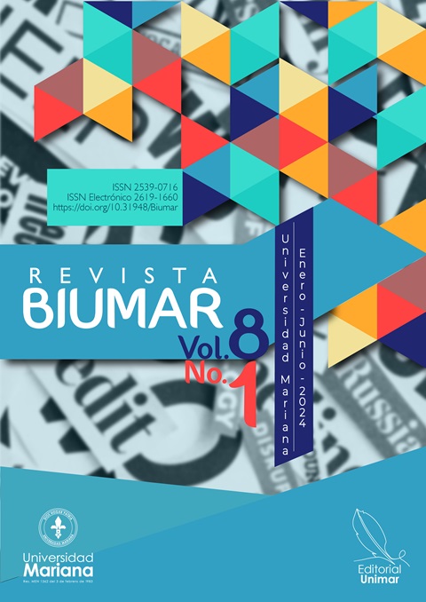 Vol. 8 Núm. 1 (2024)La Revista BIUMAR surge como una iniciativa del equipo de trabajo de la Vicerrectoría de Desarrollo Humano Integral y más propiamente del grupo de investigación denominado Bienestar y Desarrollo Humano. Un grupo multidisciplinar joven que busca proyectase en el campo investigativo en coherencia con el principio rector de bienestar universitario que es el desarrollo humano