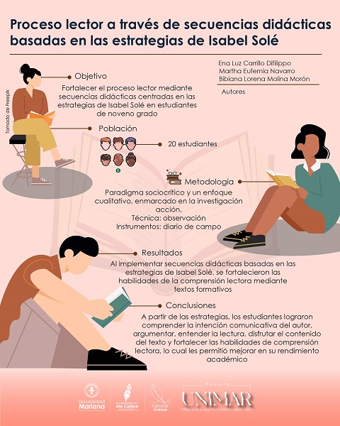 Objetivo: fortalecer el proceso lector mediante secuencias didácticas centradas en las estrategias de Isabel Solé en estudiantes de noveno grado. Metodología: el estudio se desarrolló desde un paradigma sociocrítico y un enfoque cualitativo, enmarcado en la investigación acción. Se desarrolló en cuatro fases: diagnóstico, planificación de las acciones, ejecución de las acciones y reflexión. La unidad de trabajo estuvo conformada por 20 estudiantes. Para la recolección de datos, se utilizó la técnica de la observación, y como instrumentos, la observación y el diario de campo. Resultados: al implementar secuencias didácticas basadas en las estrategias de Isabel Solé, se fortalecieron las habilidades de la comprensión lectora mediante textos formativos. Conclusiones: A partir de las estrategias, los estudiantes lograron comprender la intención comunicativa del autor, argumentar, entender la lectura, disfrutar el contenido del texto y fortalecer las habilidades de comprensión lectora, lo cual les permitió mejorar en su rendimiento académico.