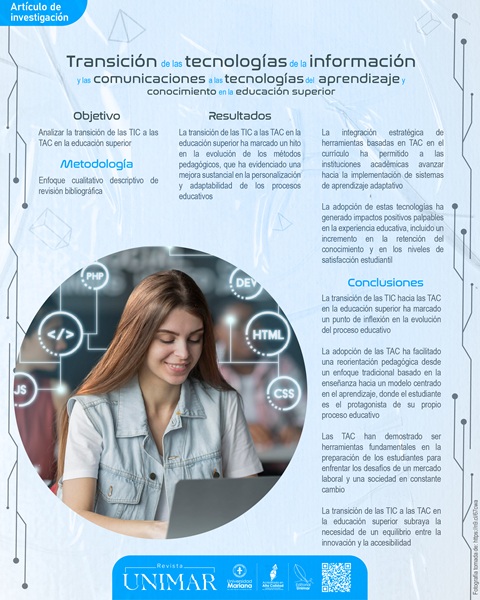 La evolución de la tecnología en la educación superior, desde las tecnologías de la información y la comunicación (TIC) hacia las tecnologías de aprendizaje y conocimiento (TAC), refleja un cambio significativo en cómo se concibe y se implementa el proceso educativo. Inicialmente, las TIC transformaron la accesibilidad a la información y mejoraron la comunicación educativa, permitiendo un mayor alcance y eficiencia. No obstante, el progreso tecnológico y las nuevas exigencias educativas han impulsado una transición hacia las TAC, poniendo énfasis no solo en el acceso a la información, sino también en la transformación del aprendizaje y la enseñanza. Por lo tanto, el presente estudio tuvo como objetivo analizar la transición de las TIC a las TAC en la educación superior. Metodológicamente, se basó en un enfoque cualitativo descriptivo de revisión bibliográfica. Entre los resultados principales, se determinó que las TAC promueven un aprendizaje más interactivo, personalizado y centrado en el estudiante, subrayando la importancia de construir conocimiento, desarrollar habilidades críticas y fomentar la adaptabilidad. Este cambio hacia un enfoque pedagógico integrado con tecnologías avanzadas prepara a los estudiantes para los desafíos futuros y redefine el concepto de aprendizaje en el siglo XXI; además, promete mejoras significativas en la eficiencia y la calidad de la educación superior.